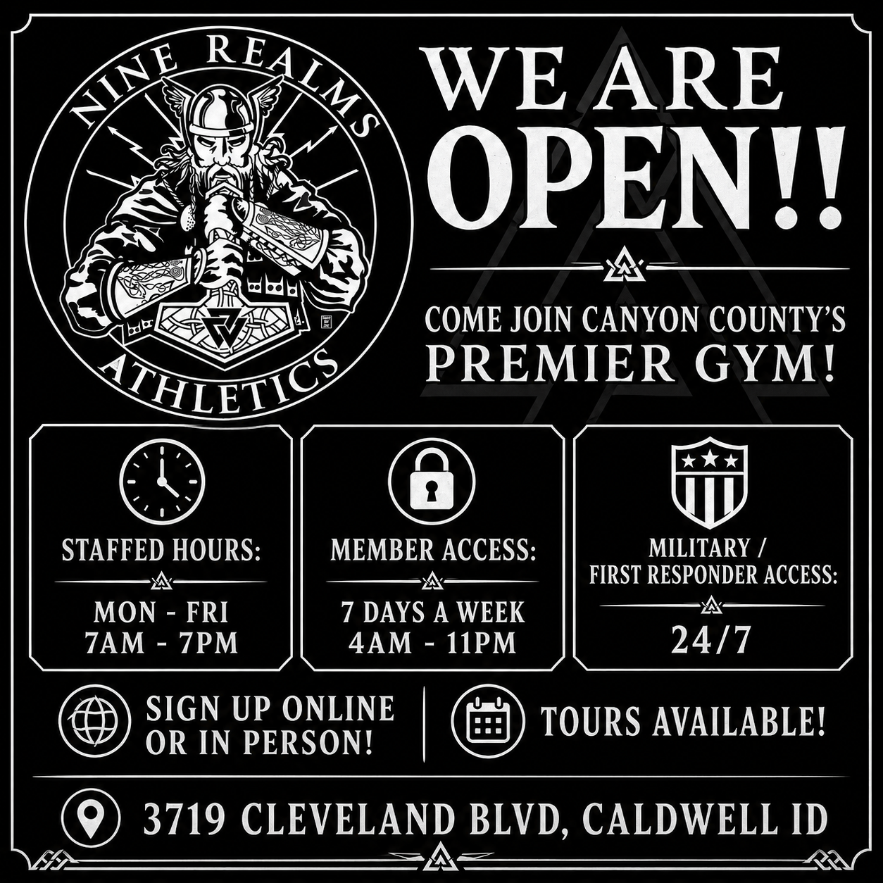Are you ready to transform your life? Well you've got a new home. Nine Realms Athletics is now open! We are the premier gym in Canyon County, Idaho! Filled with top tier brands such as Arsenal Strength, Elite FTS, Megamass, Raw Motive Works, Prime, and many more, Nine Realms Athletics has the tools to get you to your goals!